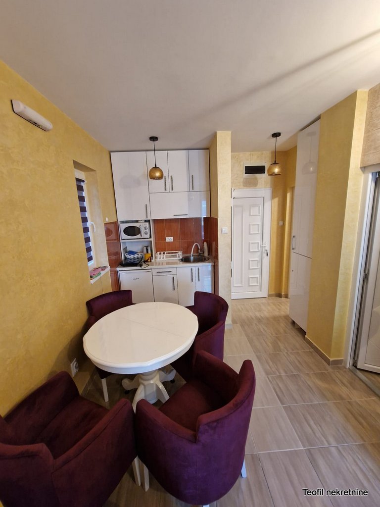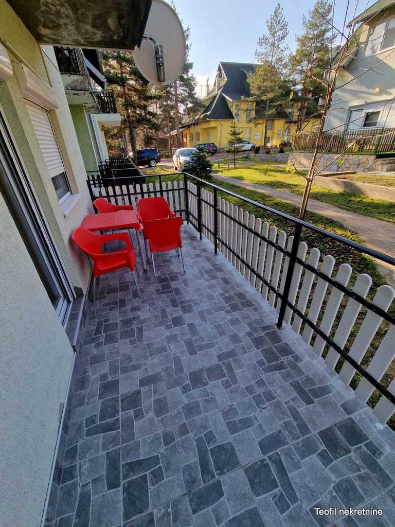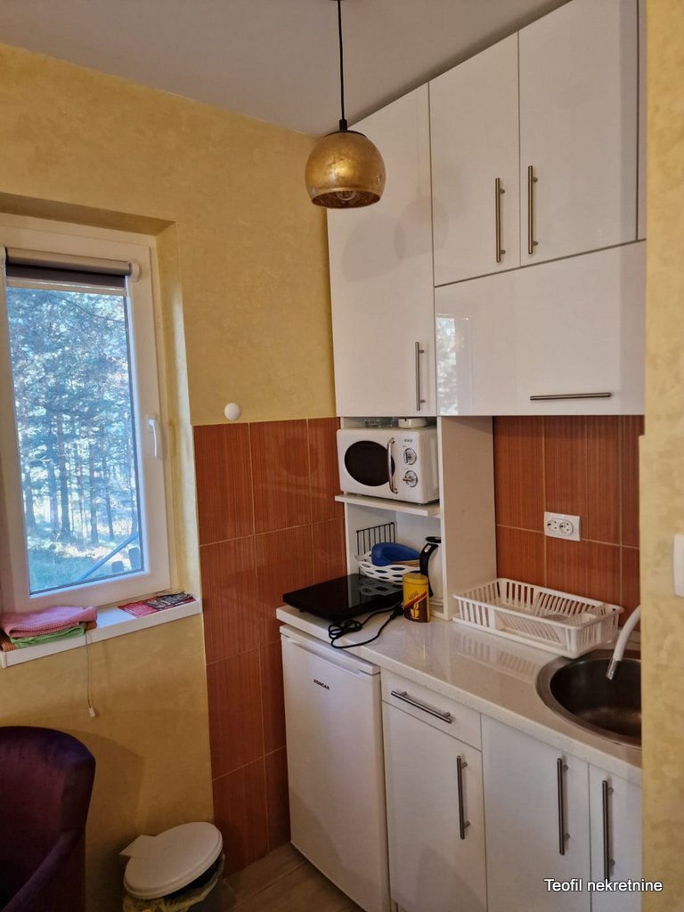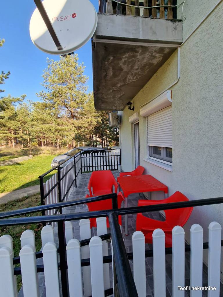 Apartman u prizemlju stambenog objekta, površine 31m2+6m2 terasa. Parking mesto na parkingu zgrade koja se nalazi pored borove šume i u blizini potoka. Opremljen svom infrastrukturom (struja, voda, kablovska, podnim grejanjem..), odvojena spavaća soba. Useljiv.