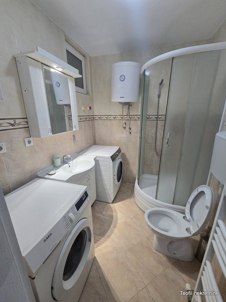 Sastoji od predsoblja, dnevnog boravka sa trpezarijom i kuhinjom, zasebne spavaće sobe i kupatila u kojem se nalaze mašina za pranje i za sušenje veša. Stan ima centralno grejanje na gas, pa su mali računi za infostan jer se grejanje plaća na mesečnom nivou u sezoni, po potrošnji.